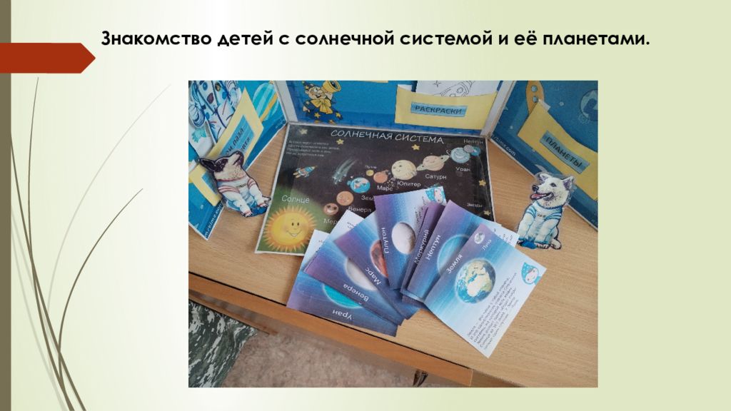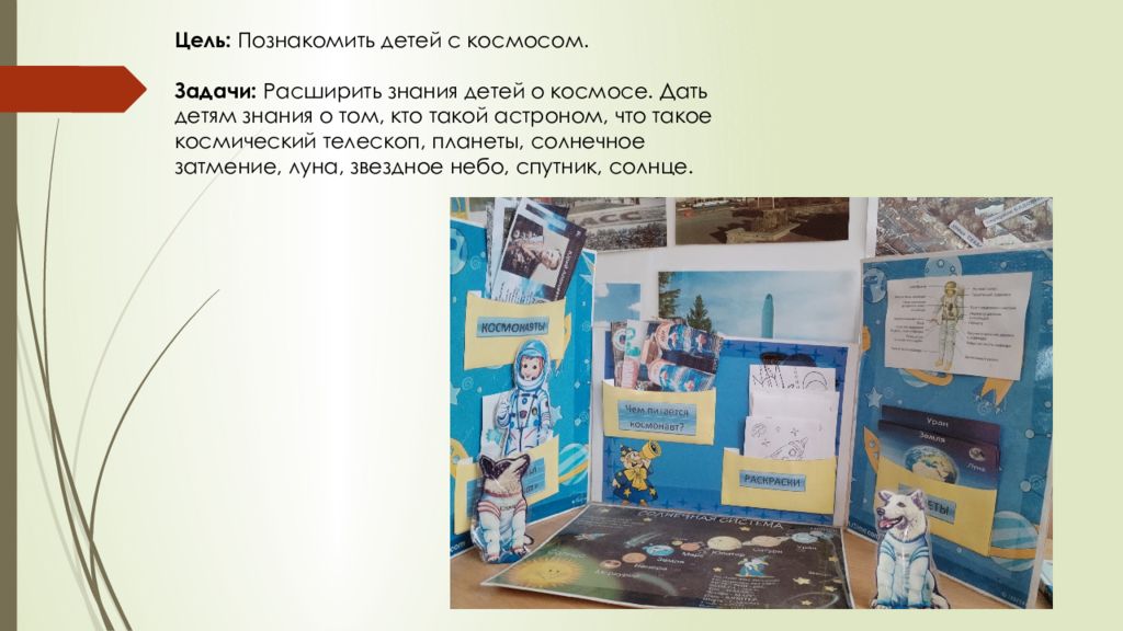 Цель: Познакомить детей с космосом. Задачи: Расширить знания детей о космосе. Дать детям знания о том, кто такой астроном, что такое космический телескоп, планеты, солнечное затмение, луна, звездное небо, спутник, солнце.