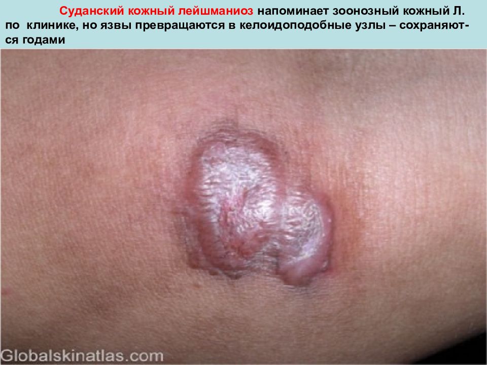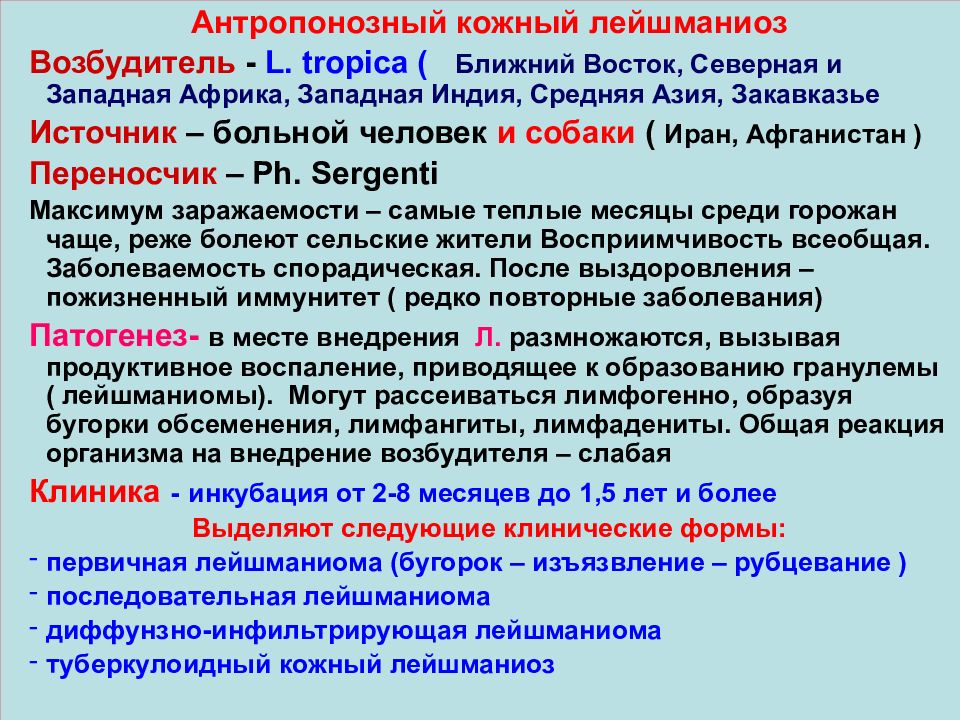 Антропонозный кожный лейшманиоз Возбудитель - L. tropica ( Ближний Восток, Северная и Западная Африка, Западная Индия, Средняя Азия, Закавказье Источник – больной человек и собаки ( Иран, Афганистан ) Переносчик – Ph. Sergenti Максимум заражаемости – самые теплые месяцы среди горожан чаще, реже болеют сельские жители Восприимчивость всеобщая. Заболеваемость спорадическая. После выздоровления – пожизненный иммунитет ( редко повторные заболевания) Патогенез- в месте внедрения Л. размножаются, вызывая продуктивное воспаление, приводящее к образованию гранулемы ( лейшманиомы). Могут рассеиваться лимфогенно, образуя бугорки обсеменения, лимфангиты, лимфадениты. Общая реакция организма на внедрение возбудителя – слабая Клиника - инкубация от 2-8 месяцев до 1,5 лет и более Выделяют следующие клинические формы: первичная лейшманиома (бугорок – изъязвление – рубцевание ) последовательная лейшманиома диффунзно-инфильтрирующая лейшманиома туберкулоидный кожный лейшманиоз