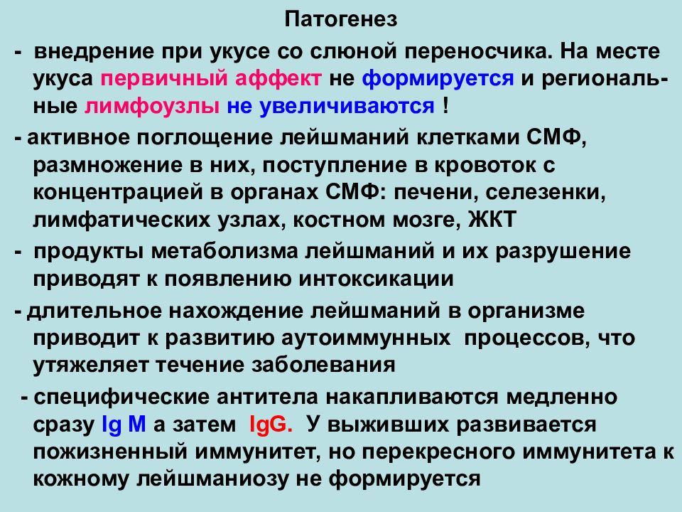 Патогенез - внедрение при укусе со слюной переносчика. На месте укуса первичный аффект не формируется и региональ-ные лимфоузлы не увеличиваются ! - активное поглощение лейшманий клетками СМФ, размножение в них, поступление в кровоток с концентрацией в органах СМФ: печени, селезенки, лимфатических узлах, костном мозге, ЖКТ - продукты метаболизма лейшманий и их разрушение приводят к появлению интоксикации - длительное нахождение лейшманий в организме приводит к развитию аутоиммунных процессов, что утяжеляет течение заболевания - специфические антитела накапливаются медленно сразу Ig M a затем IgG. У выживших развивается пожизненный иммунитет, но перекресного иммунитета к кожному лейшманиозу не формируется
