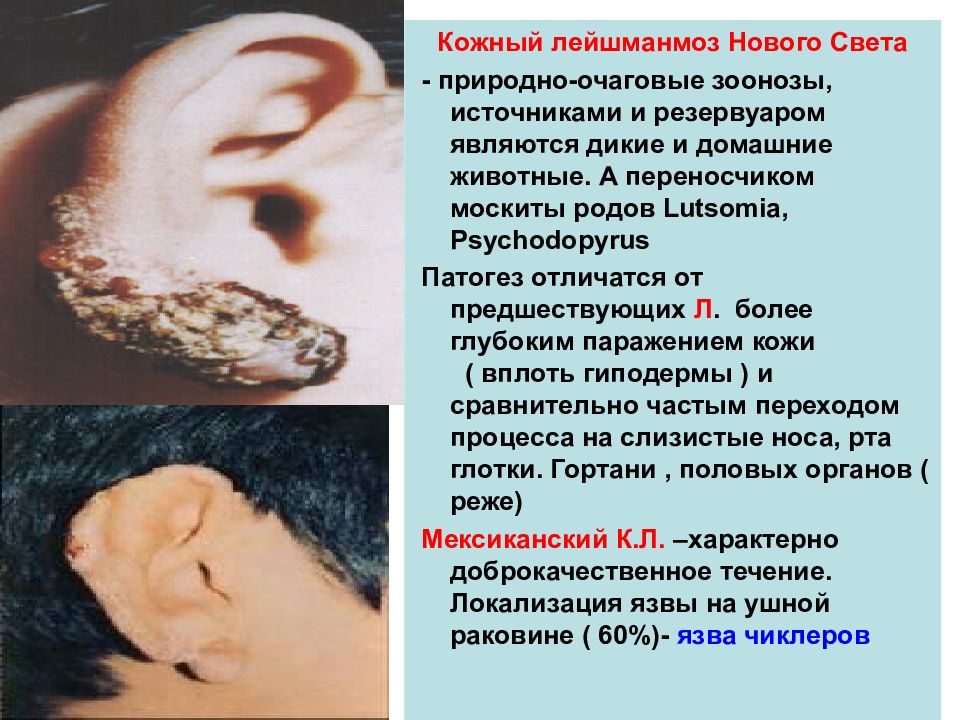 Кожный лейшманмоз Нового Света - природно-очаговые зоонозы, источниками и резервуаром являются дикие и домашние животные. А переносчиком москиты родов Lutsomia, Psychodopyrus Патогез отличатся от предшествующих Л. более глубоким паражением кожи ( вплоть гиподермы ) и сравнительно частым переходом процесса на слизистые носа, рта глотки. Гортани, половых органов ( реже) Мексиканский К.Л. –характерно доброкачественное течение. Локализация язвы на ушной раковине ( 60%)- язва чиклеров