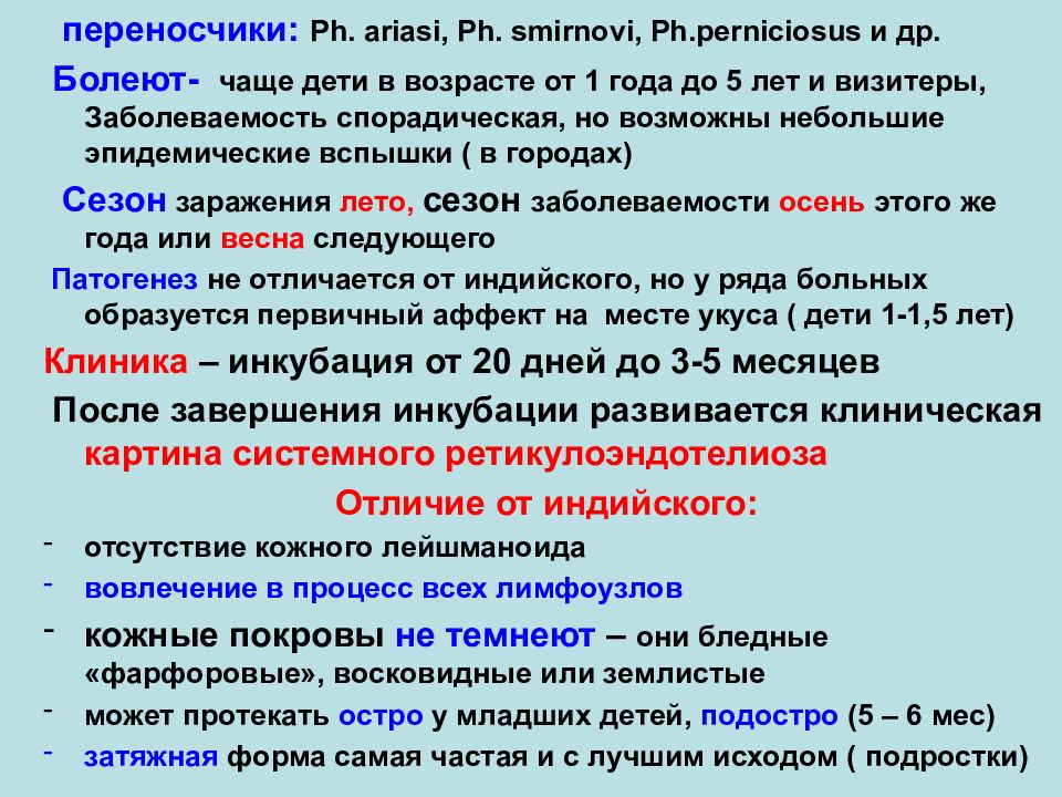 переносчики: Р h. а riasi, Ph. smirnovi, Ph.perniciosus и др. Болеют- чаще дети в возрасте от 1 года до 5 лет и визитеры, Заболеваемость спорадическая, но возможны небольшие эпидемические вспышки ( в городах) Сезон заражения лето, сезон заболеваемости осень этого же года или весна следующего Патогенез не отличается от индийского, но у ряда больных образуется первичный аффект на месте укуса ( дети 1-1,5 лет) Клиника – инкубация от 20 дней до 3-5 месяцев После завершения инкубации развивается клиническая картина системного ретикулоэндотелиоза Отличие от индийского: отсутствие кожного лейшманоида вовлечение в процесс всех лимфоузлов кожные покровы не темнеют – они бледные «фарфоровые», восковидные или землистые может протекать остро у младших детей, подостро (5 – 6 мес) затяжная форма самая частая и с лучшим исходом ( подростки)