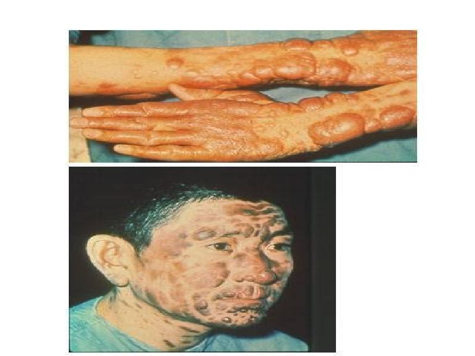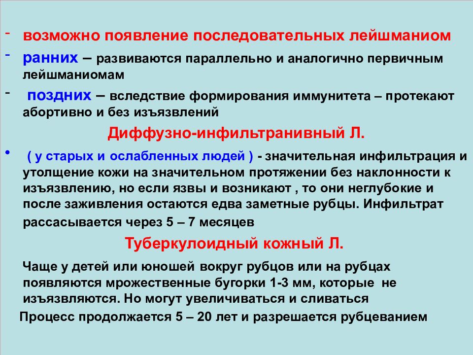 возможно появление последовательных лейшманиом ранних – развиваются параллельно и аналогично первичным лейшманиомам поздних – вследствие формирования иммунитета – протекают абортивно и без изъязвлений Диффузно-инфильтранивный Л. ( у старых и ослабленных людей ) - значительная инфильтрация и утолщение кожи на значительном протяжении без наклонности к изъязвлению, но если язвы и возникают, то они неглубокие и после заживления остаются едва заметные рубцы. Инфильтрат рассасывается через 5 – 7 месяцев Туберкулоидный кожный Л. Чаще у детей или юношей вокруг рубцов или на рубцах появляются мрожественные бугорки 1-3 мм, которые не изъязвляются. Но могут увеличиваться и сливаться Процесс продолжается 5 – 20 лет и разрешается рубцеванием