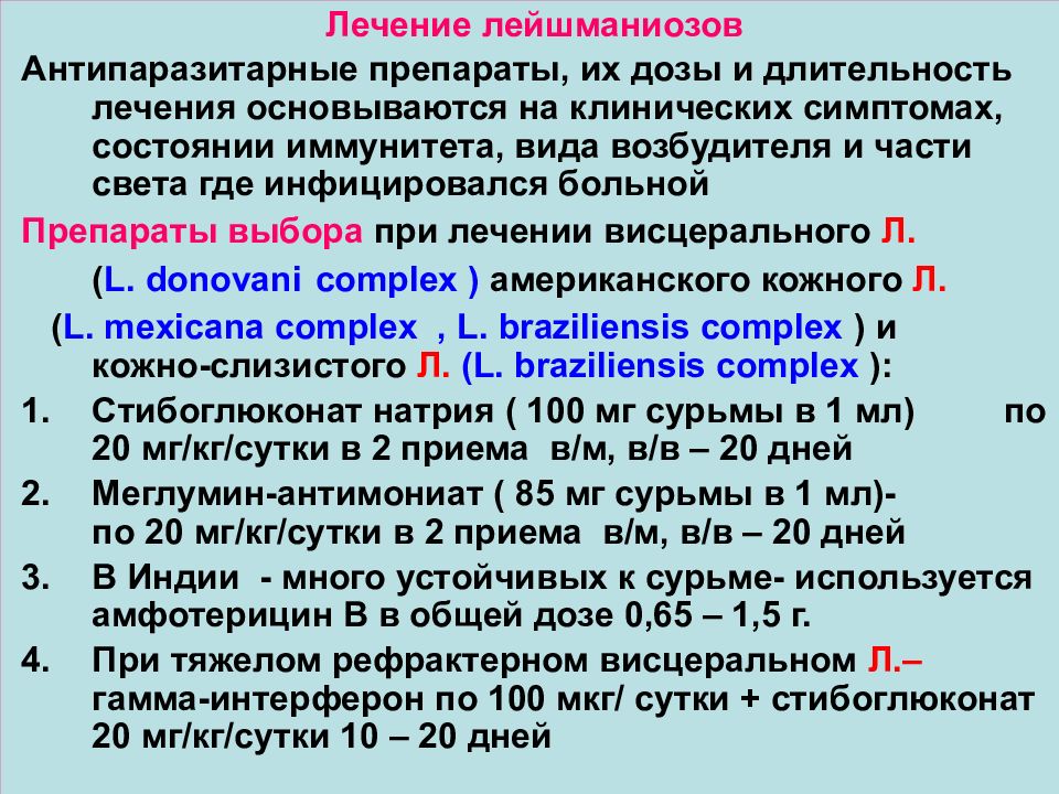 Лечение лейшманиозов Антипаразитарные препараты, их дозы и длительность лечения основываются на клинических симптомах, состоянии иммунитета, вида возбудителя и части света где инфицировался больной Препараты выбора при лечении висцерального Л. ( L. donovani complex ) американского кожного Л. ( L. mexicana complex, L. braziliensis complex ) и кожно-слизистого Л. ( L. braziliensis complex ): Стибоглюконат натрия ( 100 мг сурьмы в 1 мл) по 20 мг/кг/сутки в 2 приема в/м, в/в – 20 дней Меглумин-антимониат ( 85 мг сурьмы в 1 мл)- по 20 мг/кг/сутки в 2 приема в/м, в/в – 20 дней В Индии - много устойчивых к сурьме- используется амфотерицин В в общей дозе 0,65 – 1,5 г. При тяжелом рефрактерном висцеральном Л.– гамма-интерферон по 100 мкг/ сутки + стибоглюконат 20 мг/кг/сутки 10 – 20 дней