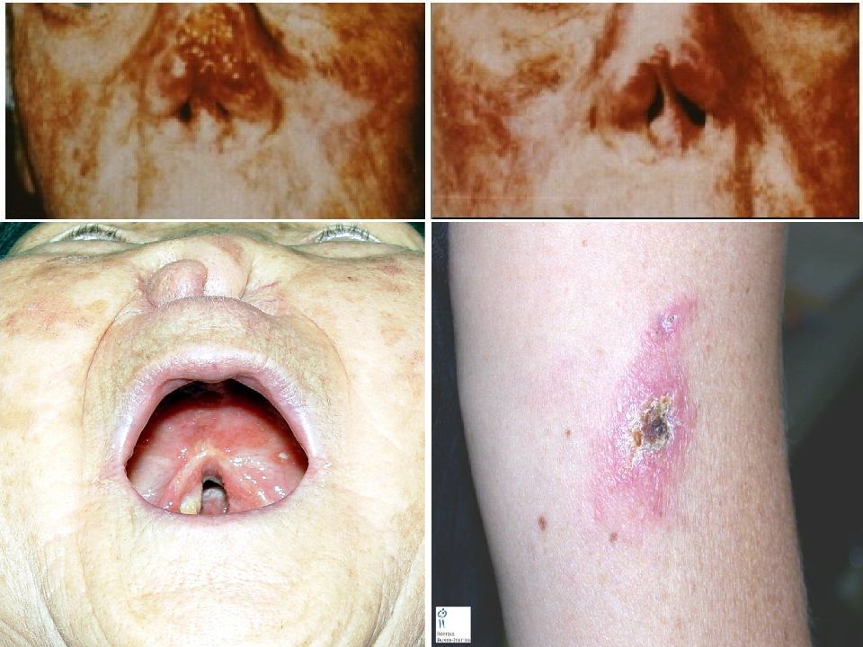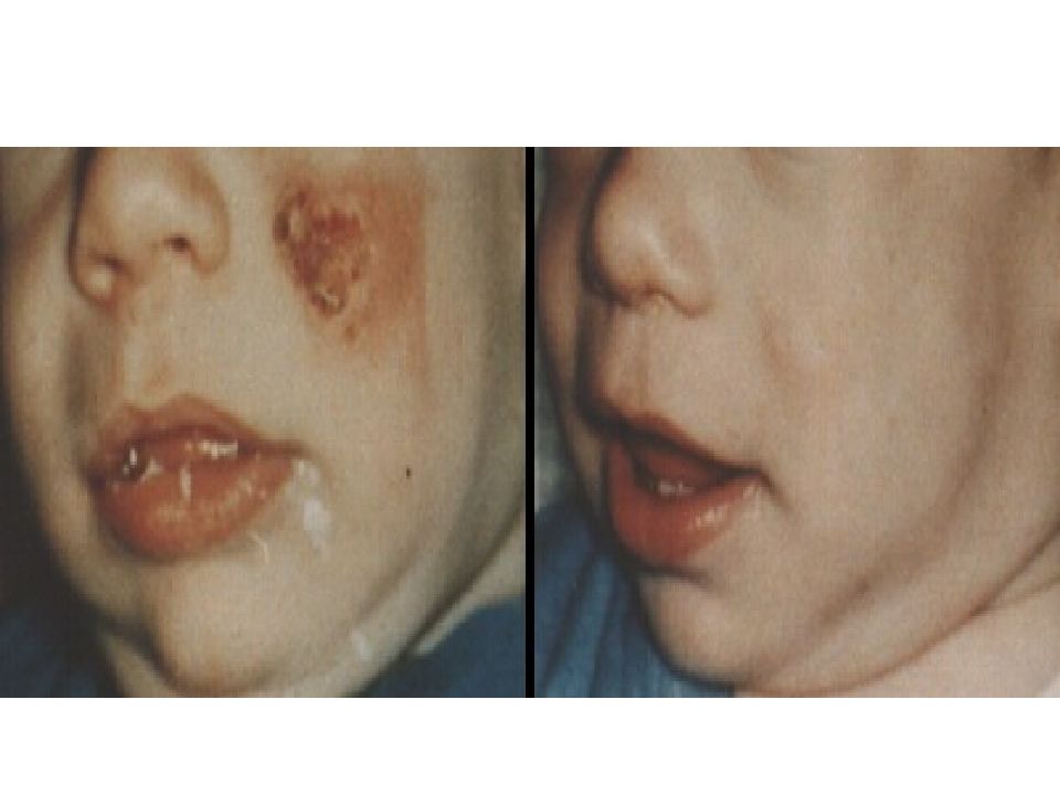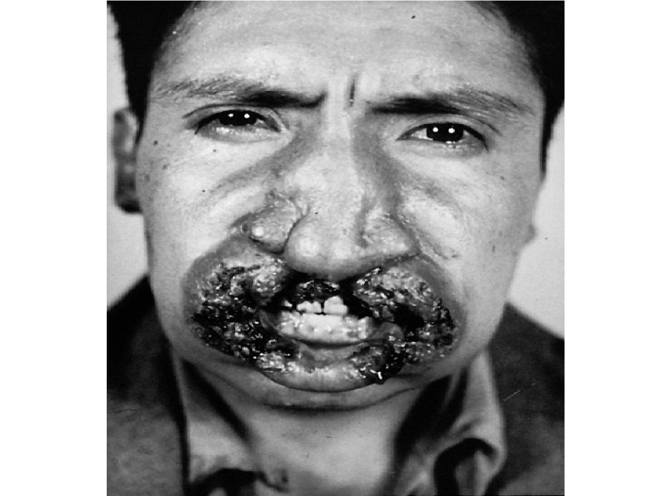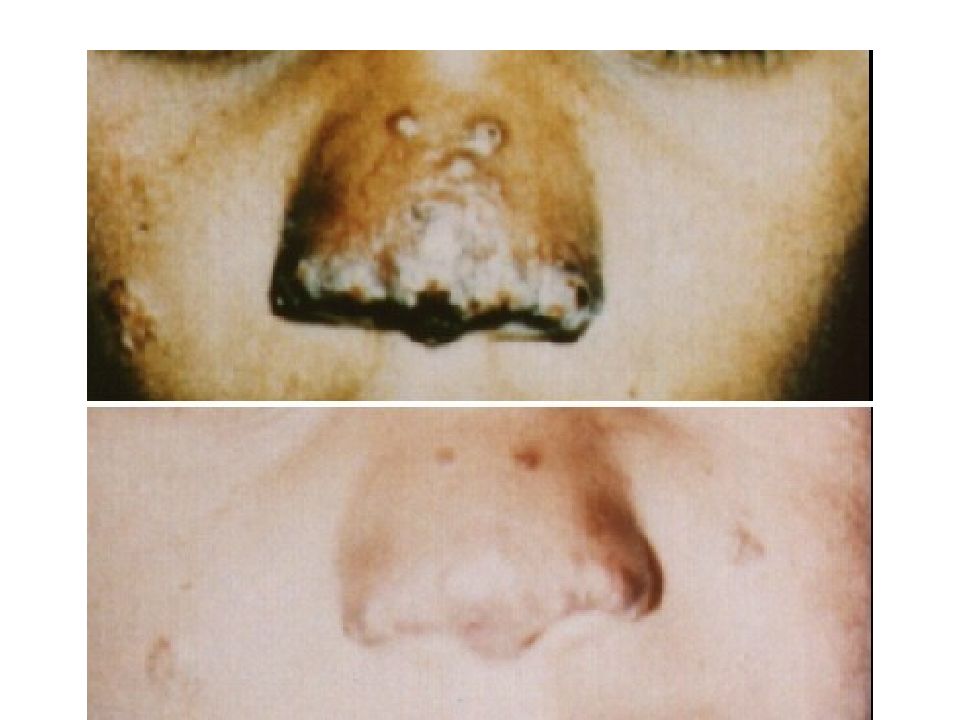 Перуанский (ута), Венесуельский, Гвианский К.Л. имеет относительно доброкачественное течение. Панамский К.Л.- самый частый и самый тяжелый из всех К.Л. Нового Света: - спонтанного заживления язв не наблюдается - часто лимфогенная диссеминация лейшманий - поверхность язв влажная, мокнущая, легко инфицируентся язвы болезненные, особенно при локализации вокруг рта Кожно-слизистый Л. протекает найболее тяжело и кожные проявления напоминают поражения как при Панамском К.Л., при этом процесс перебрасывается на слизистые носа, мягкого неба, глотки, гортани, трахеи половых органов. При лечении выздоровление возможно, но тогда остаются тяжелые последствия разрушения носовой перегородки « нос тапира», голосовых связок