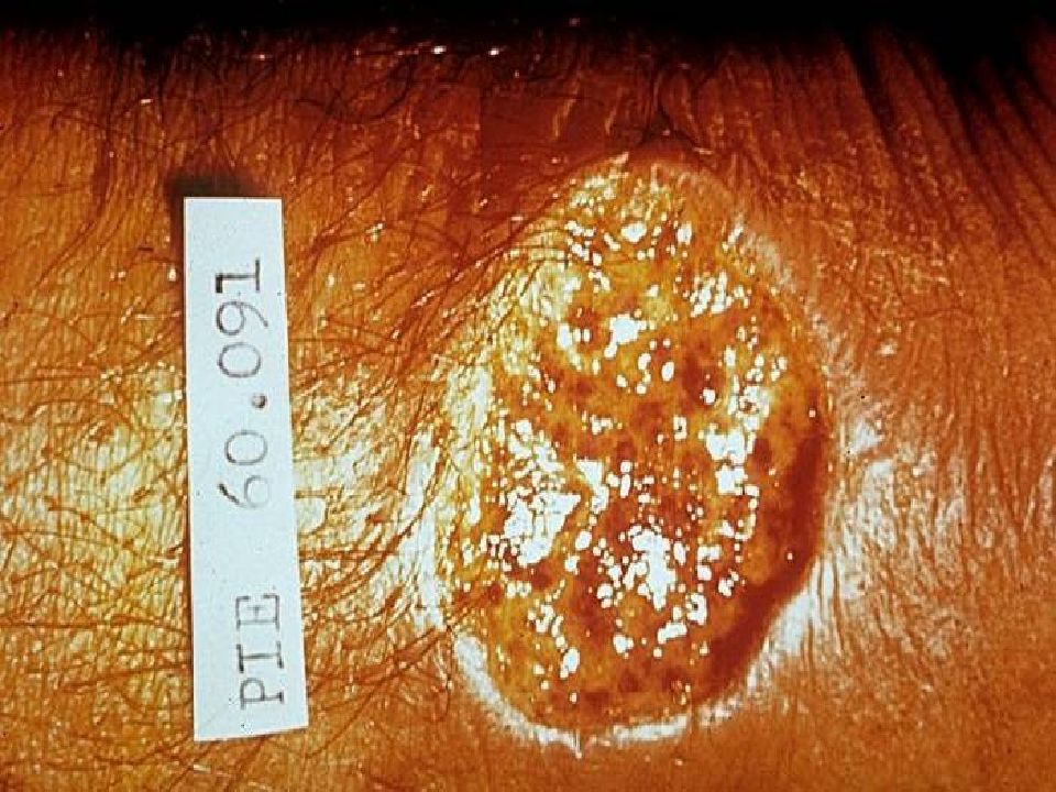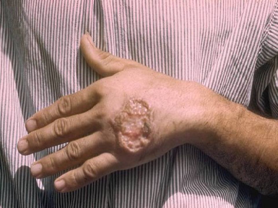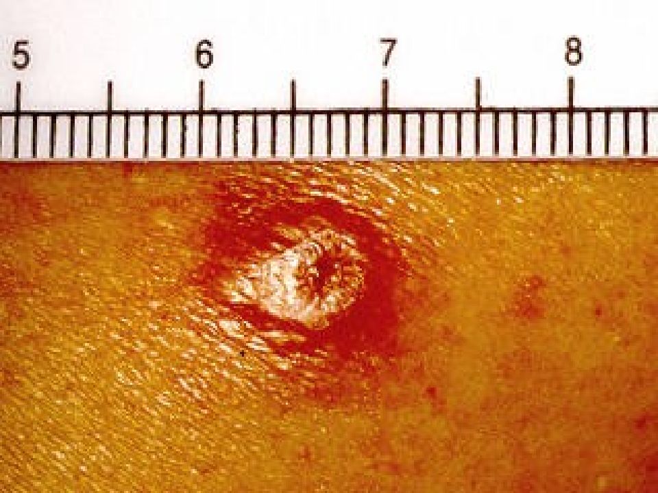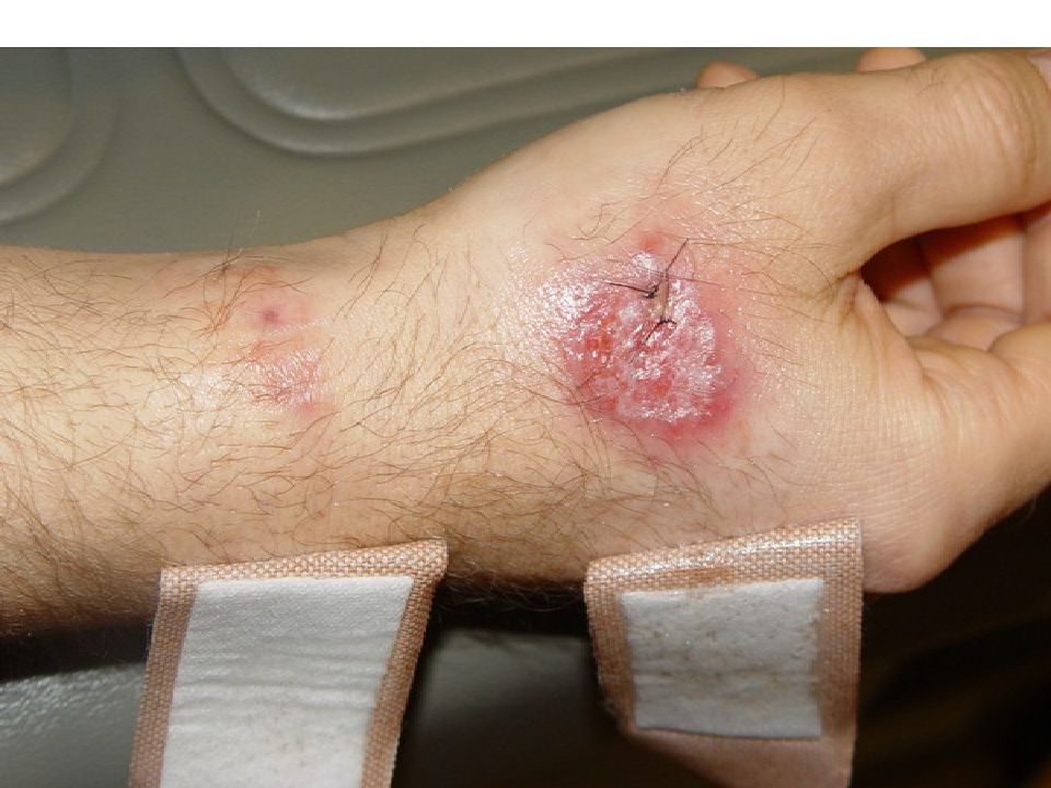 В местах внедрения Л. появляется гладкая папула розового цвета диаметром 2-3 мм, медленно увеличи-вается до 1 – 2 см через 3-6 месяцев и покрывается коркой. Через 6 – 10 мес. корка отпадает обнажая поверхнос-тную овальную язву с неровными краями с зернистым дном и гнойным налетом на нем. Вокруг язвы и под ней пальпаторно определяется плотный инфильтрат. К 8 – 12-му месяцу она может достигать 4 - 6 см. Спустя несколько месяцев происходит рубцевание. рубец сразу розовый, затем бледный, атрофичный. язвы чаще безболезненные с локализацией на лице или верхних конечностях, число 1-3, редко 8 - 10 от появления папулы до рубца проходит 1 год и более