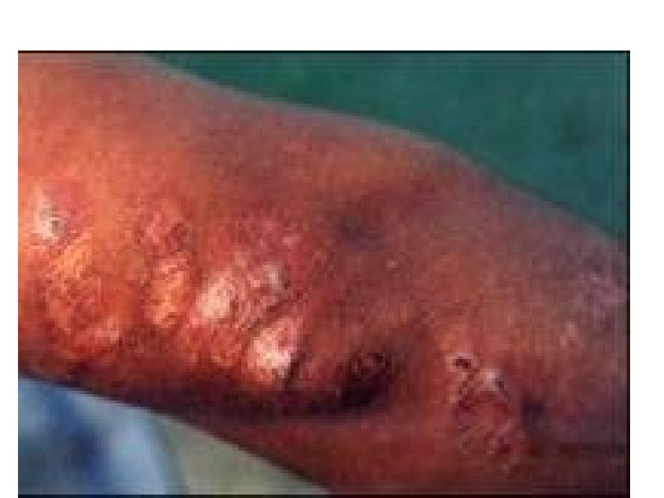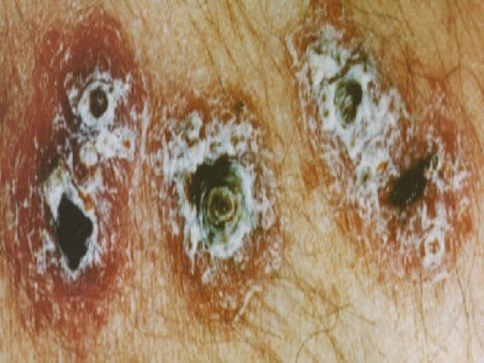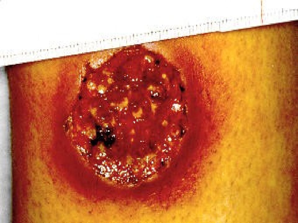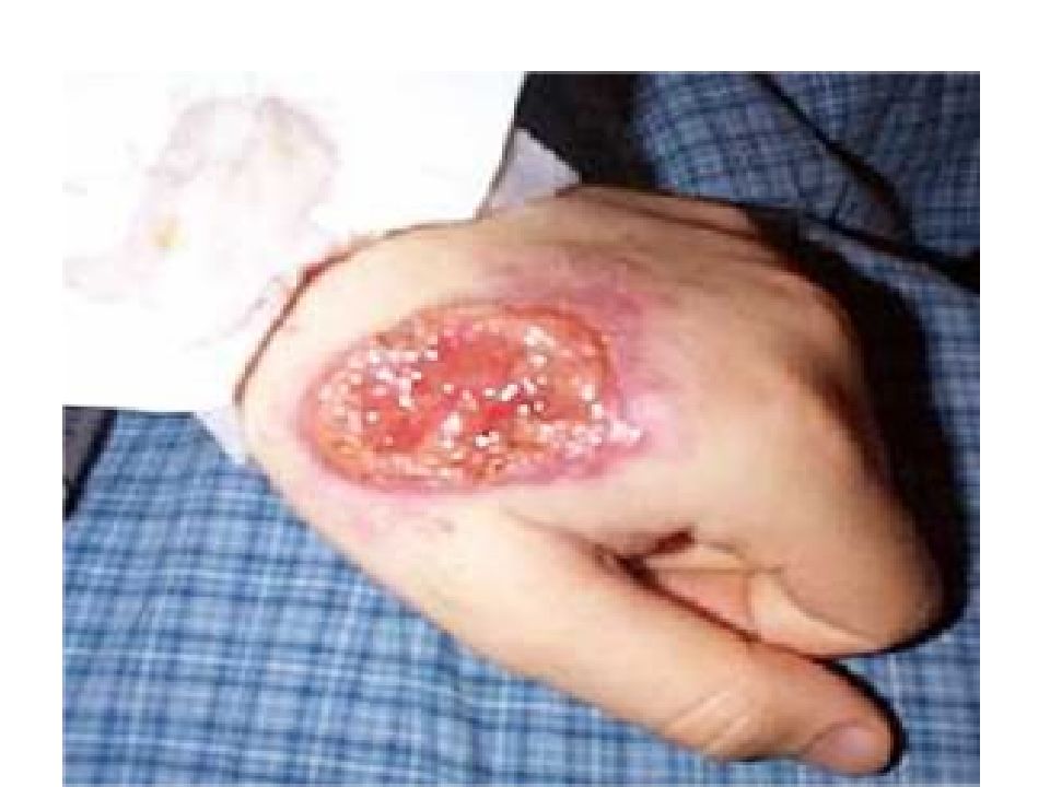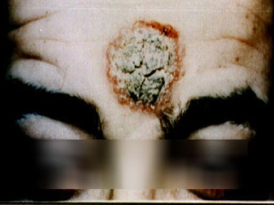 В местах внедрения Л. появляется гладкая папула розового цвета диаметром 2-3 мм, медленно увеличи-вается до 1 – 2 см через 3-6 месяцев и покрывается коркой. Через 6 – 10 мес. корка отпадает обнажая поверхнос-тную овальную язву с неровными краями с зернистым дном и гнойным налетом на нем. Вокруг язвы и под ней пальпаторно определяется плотный инфильтрат. К 8 – 12-му месяцу она может достигать 4 - 6 см. Спустя несколько месяцев происходит рубцевание. рубец сразу розовый, затем бледный, атрофичный. язвы чаще безболезненные с локализацией на лице или верхних конечностях, число 1-3, редко 8 - 10 от появления папулы до рубца проходит 1 год и более