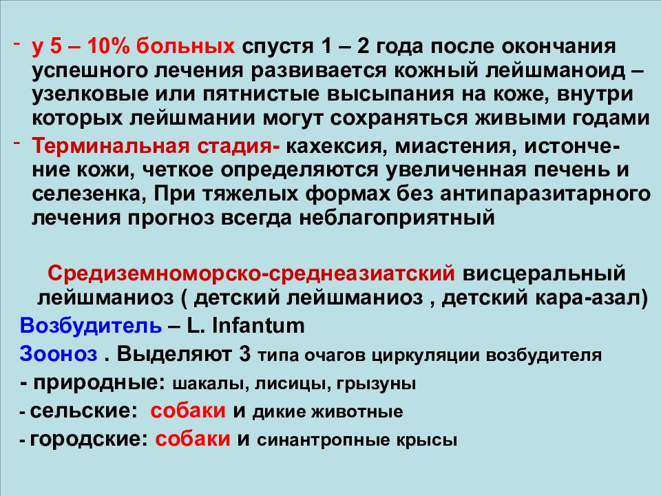 у 5 – 10% больных спустя 1 – 2 года после окончания успешного лечения развивается кожный лейшманоид –узелковые или пятнистые высыпания на коже, внутри которых лейшмании могут сохраняться живыми годами Терминальная стадия- кахексия, миастения, истонче-ние кожи, четкое определяются увеличенная печень и селезенка, При тяжелых формах без антипаразитарного лечения прогноз всегда неблагоприятный Средиземноморско-среднеазиатский висцеральный лейшманиоз ( детский лейшманиоз, детский кара-азал) Возбудитель – L. Infantum Зооноз. Выделяют 3 типа очагов циркуляции возбудителя - природные: шакалы, лисицы, грызуны - сельские: собаки и дикие животные - городские: собаки и синантропные крысы