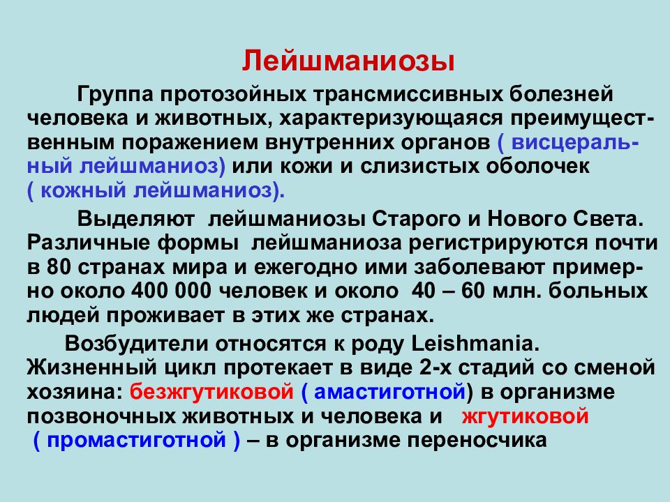 Лейшманиозы Группа протозойных трансмиссивных болезней человека и животных, характеризующаяся преимущест-венным поражением внутренних органов ( висцераль-ный лейшманиоз) или кожи и слизистых оболочек ( кожный лейшманиоз). Выделяют лейшманиозы Старого и Нового Света. Различные формы лейшманиоза регистрируются почти в 80 странах мира и ежегодно ими заболевают пример-но около 400 000 человек и около 40 – 60 млн. больных людей проживает в этих же странах. Возбудители относятся к роду Leishmania. Жизненный цикл протекает в виде 2-х стадий со сменой хозяина: безжгутиковой ( амастиготной ) в организме позвоночных животных и человека и жгутиковой ( промастиготной ) – в организме переносчика