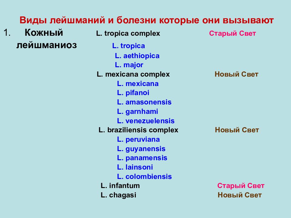 Виды лейшманий и болезни которые они вызывают 1. Кожный L. tropica complex Старый Свет лейшманиоз L. tropica L. aethiopica L. major L. mexicana complex Новый Свет L. mexicana L. pifanoi L. amasonensis L. garnhami L. venezuelensis L. braziliensis complex Новый Свет L. peruviana L. guyanensis L. panamensis L. lainsoni L. colombiensis L. infantum Старый Свет L. chagasi Новый Свет