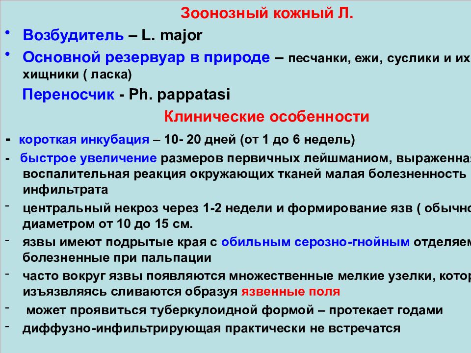Зоонозный кожный Л. Возбудитель – L. major Основной резервуар в природе – песчанки, ежи, суслики и их хищники ( ласка) Переносчик - Ph. р appatasi Клинические особенности - короткая инкубация – 10- 20 дней (от 1 до 6 недель) - быстрое увеличение размеров первичных лейшманиом, выраженная воспалительная реакция окружающих тканей малая болезненность инфильтрата центральный некроз через 1-2 недели и формирование язв ( обычно 5 – 6 ) диаметром от 10 до 15 см. язвы имеют подрытые края с обильным серозно-гнойным отделяемым, болезненные при пальпации часто вокруг язвы появляются множественные мелкие узелки, которые изъязвляясь сливаются образуя язвенные поля может проявиться туберкулоидной формой – протекает годами диффузно-инфильтрирующая практически не встречатся