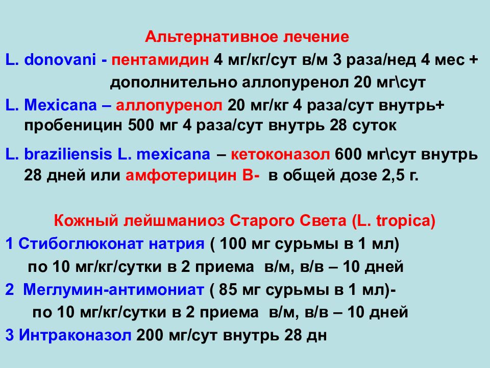 Альтернативное лечение L. donovani - пентамидин 4 мг/кг/сут в/м 3 раза/нед 4 мес + дополнительно аллопуренол 20 мг\сут L. Mexicana – аллопуренол 20 мг/кг 4 раза/сут внутрь+ пробеницин 500 мг 4 раза/сут внутрь 28 суток L. braziliensis L. mexicana – кетоконазол 600 мг\сут внутрь 28 дней или амфотерицин В- в общей дозе 2,5 г. Кожный лейшманиоз Старого Света ( L. tropica ) 1 Стибоглюконат натрия ( 100 мг сурьмы в 1 мл) по 10 мг/кг/сутки в 2 приема в/м, в/в – 10 дней 2 Меглумин-антимониат ( 85 мг сурьмы в 1 мл)- по 10 мг/кг/сутки в 2 приема в/м, в/в – 10 дней 3 Интраконазол 200 мг/сут внутрь 28 дн