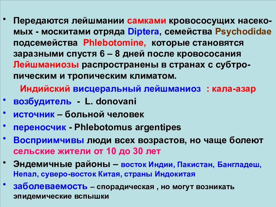 Передаются лейшмании самками кровососущих насеко - мых - москитами отряда Diptera, семейства Psych о didae подсемейства Phlebotomine, которые становятся заразными спустя 6 – 8 дней после кровососания Лейшманиозы распространены в странах с субтро-пическим и тропическим климатом. Индийский висцеральный лейшманиоз : кала-азар возбудитель - L. donovani источник – больной человек переносчик - Phlebotomus argentipes Восприимчивы люди всех возрастов, но чаще болеют сельские жители от 10 до 30 лет Эндемичные районы – восток Индии, Пакистан, Бангладеш, Непал, суверо-восток Китая, страны Индокитая заболеваемость – спорадическая, но могут возникать эпидемические вспышки