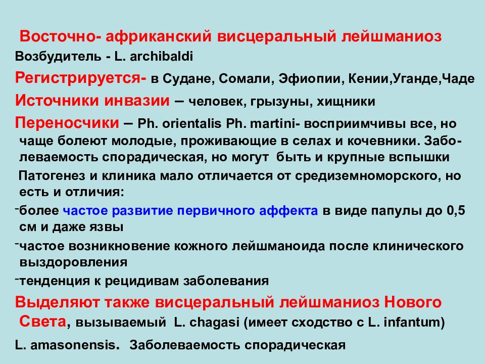 Восточно- африканский висцеральный лейшманиоз Возбудитель - L. archibaldi Регистрируется- в Судане, Сомали, Эфиопии, Кении,Уганде,Чаде Источники инвазии – человек, грызуны, хищники Переносчики – Ph. о rientalis Ph. martini- восприимчивы все, но чаще болеют молодые, проживающие в селах и кочевники. Забо- леваемость спорадическая, но могут быть и крупные вспышки Патогенез и клиника мало отличается от средиземноморского, но есть и отличия: более частое развитие первичного аффекта в виде папулы до 0,5 см и даже язвы частое возникновение кожного лейшманоида после клинического выздоровления тенденция к рецидивам заболевания Выделяют также висцеральный лейшманиоз Нового Света, вызываемый L. chagasi (имеет сходство с L. infantum ) L. amasonensis. Заболеваемость спорадическая