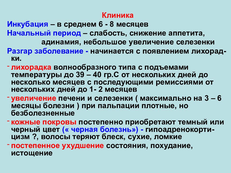 Клиника Инкубация – в среднем 6 - 8 месяцев Начальный период – слабость, снижение аппетита, адинамия, небольшое увеличение селезенки Разгар заболевание - начинается с появлением лихорад-ки. лихорадка волнообразного типа с подъемами температуры до 39 – 40 гр.С от нескольких дней до несколько месяцев с последующими ремиссиями от нескольких дней до 1- 2 месяцев увеличение печени и селезенки ( максимально на 3 – 6 месяцы болезни ) при пальпации плотные, но безболезненные кожные покровы постепенно приобретают темный или черный цвет (« черная болезнь») - гипоадренокорти-цизм ?, волосы теряют блеск, сухие, ломкие постепенное ухудшение состояния, похудание, истощение