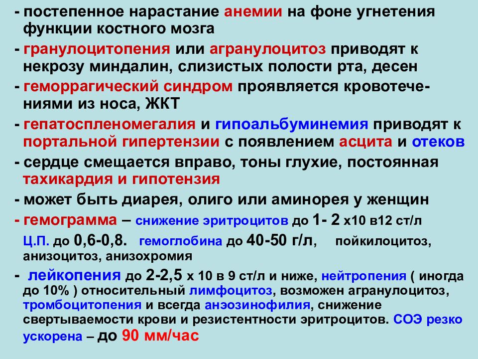 - постепенное нарастание анемии на фоне угнетения функции костного мозга - гранулоцитопения или агранулоцитоз приводят к некрозу миндалин, слизистых полости рта, десен - геморрагический синдром проявляется кровотече-ниями из носа, ЖКТ - гепатоспленомегалия и гипоальбуминемия приводят к портальной гипертензии с появлением асцита и отеков - сердце смещается вправо, тоны глухие, постоянная тахикардия и гипотензия - может быть диарея, олиго или аминорея у женщин - гемограмма – снижение эритроцитов до 1- 2 х10 в12 ст/л Ц.П. до 0,6-0,8. гемоглобина до 40-50 г/л, пойкилоцитоз, анизоцитоз, анизохромия - лейкопения до 2-2,5 х 10 в 9 ст/л и ниже, нейтропения ( иногда до 10% ) относительный лимфоцитоз, возможен агранулоцитоз, тромбоцитопения и всегда анэозинофилия, снижение свертываемости крови и резистентности эритроцитов. СОЭ резко ускорена – до 90 мм/час