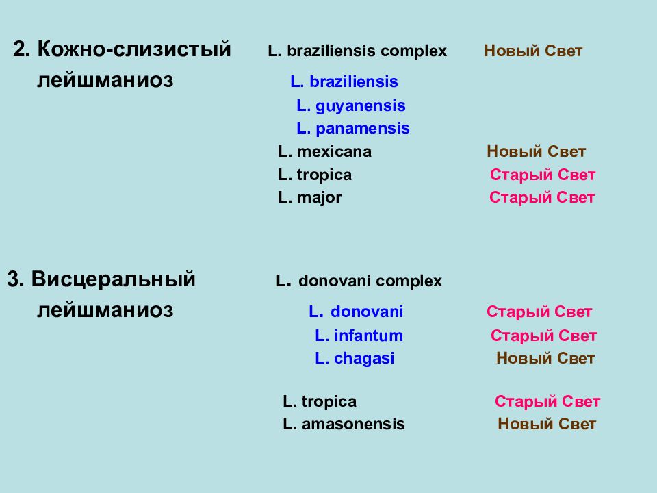 2. Кожно-слизистый L. braziliensis complex Новый Свет лейшманиоз L. braziliensis L. guyanensis L. panamensis L. mexicana Новый Свет L. tropica Старый Свет L. major Старый Свет 3. Висцеральный L. donovani complex лейшманиоз L. donovani Старый Свет L. infantum Старый Свет L. chagasi Новый Свет L. tropica Старый Свет L. amasonensis Новый Свет