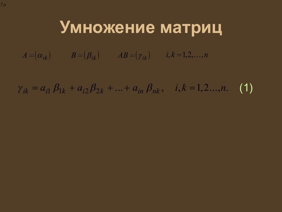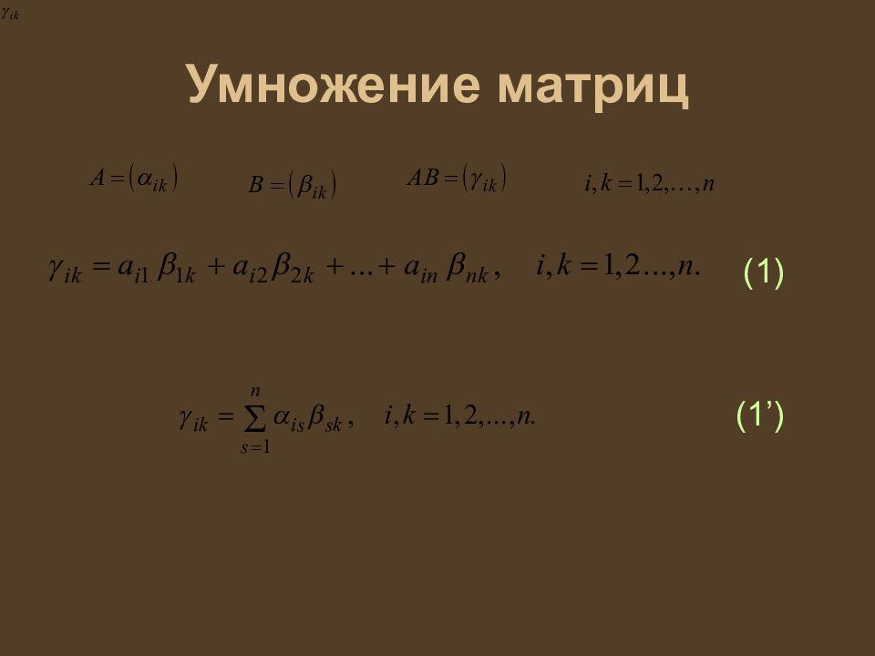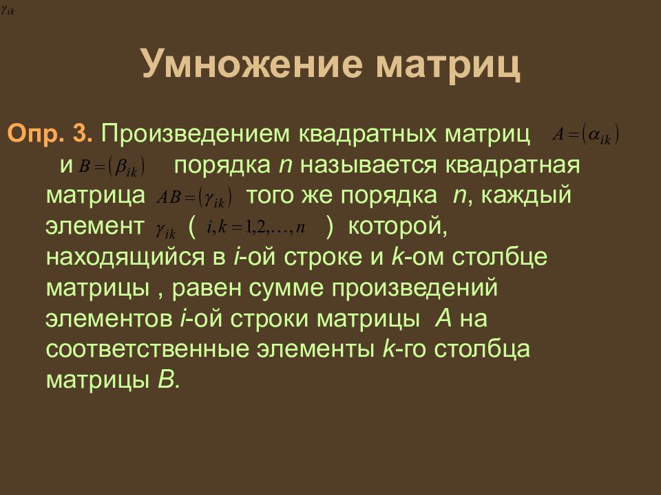 Опр. 3. Произведением квадратных матриц и порядка n называется квадратная матрица того же порядка n, каждый элемент ( ) которой, находящийся в i -ой строке и k -ом столбце матрицы, равен сумме произведений элементов i -ой строки матрицы A на соответственные элементы k -го столбца матрицы B.