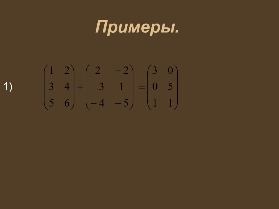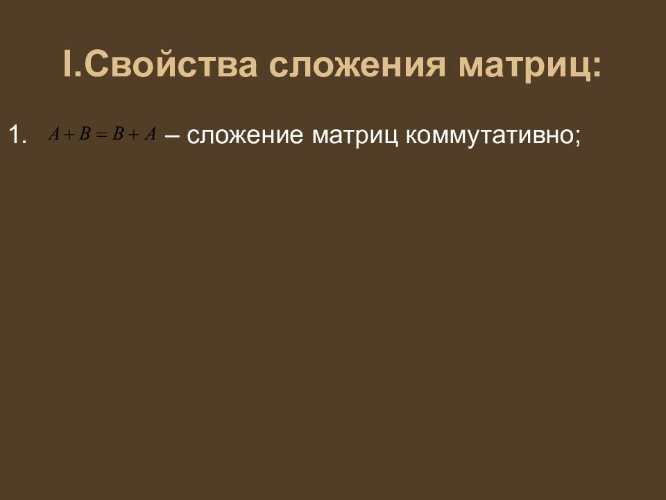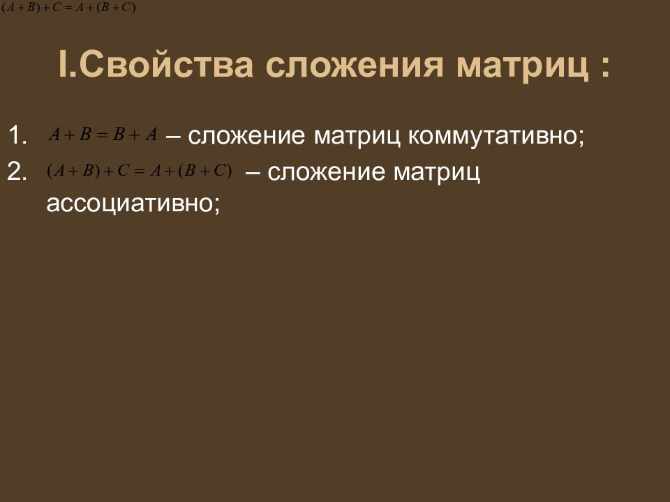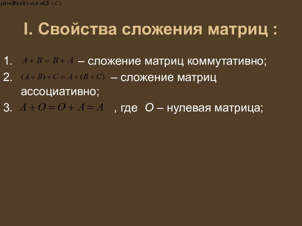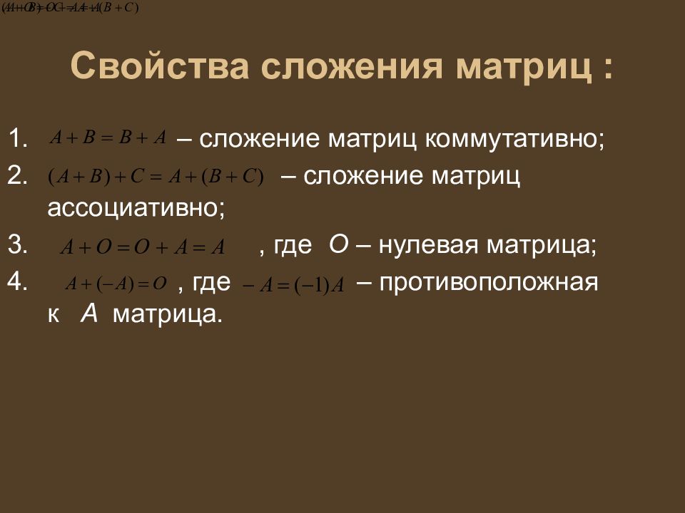 1. – сложение матриц коммутативно; 2. – сложение матриц ассоциативно;