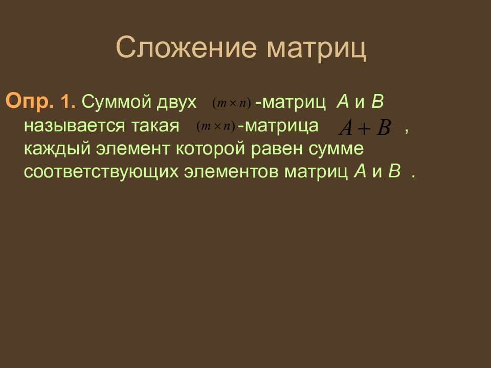 Опр. 1. Суммой двух -матриц A и B называется такая -матрица, каждый элемент которой равен сумме соответствующих элементов матриц A и B.
