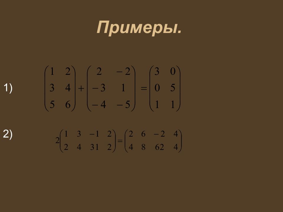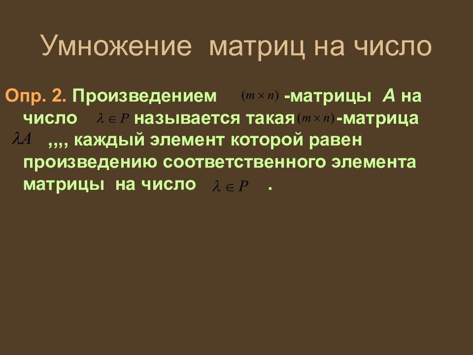 Опр. 2. Произведением -матрицы A на число называется такая -матрица,,,, каждый элемент которой равен произведению соответственного элемента матрицы на число.