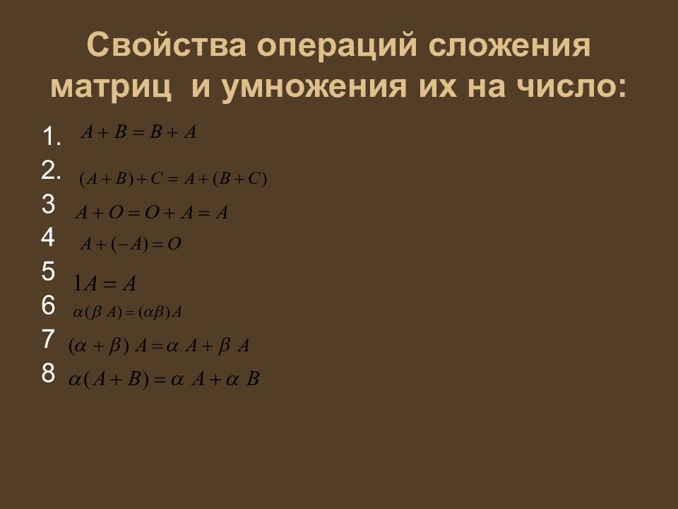 Слайд 12: Свойства операций сложения матриц и умножения их на число: