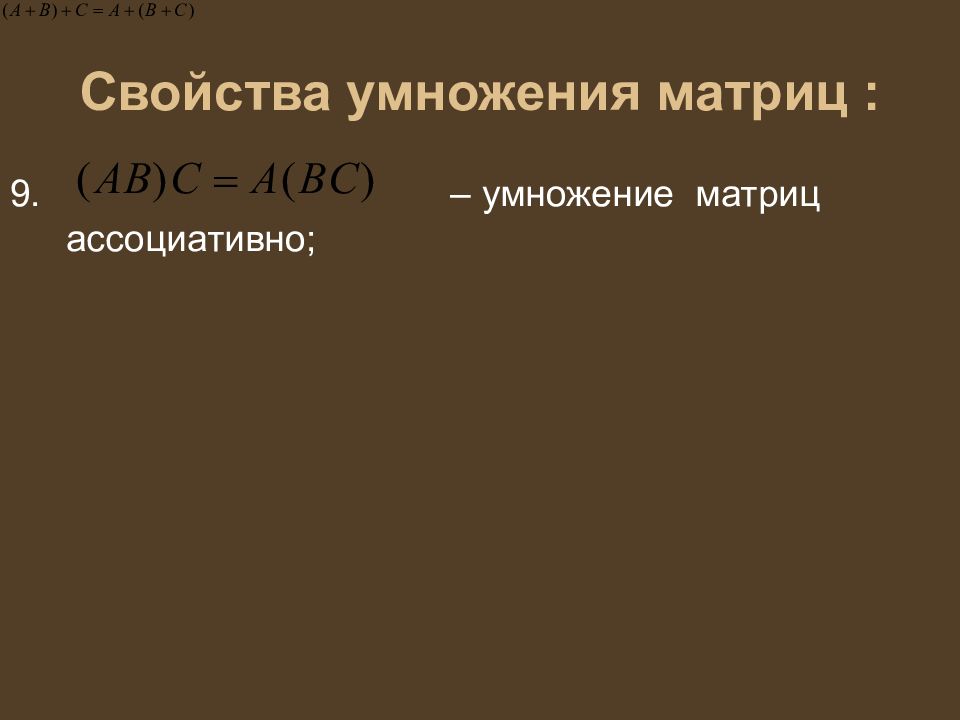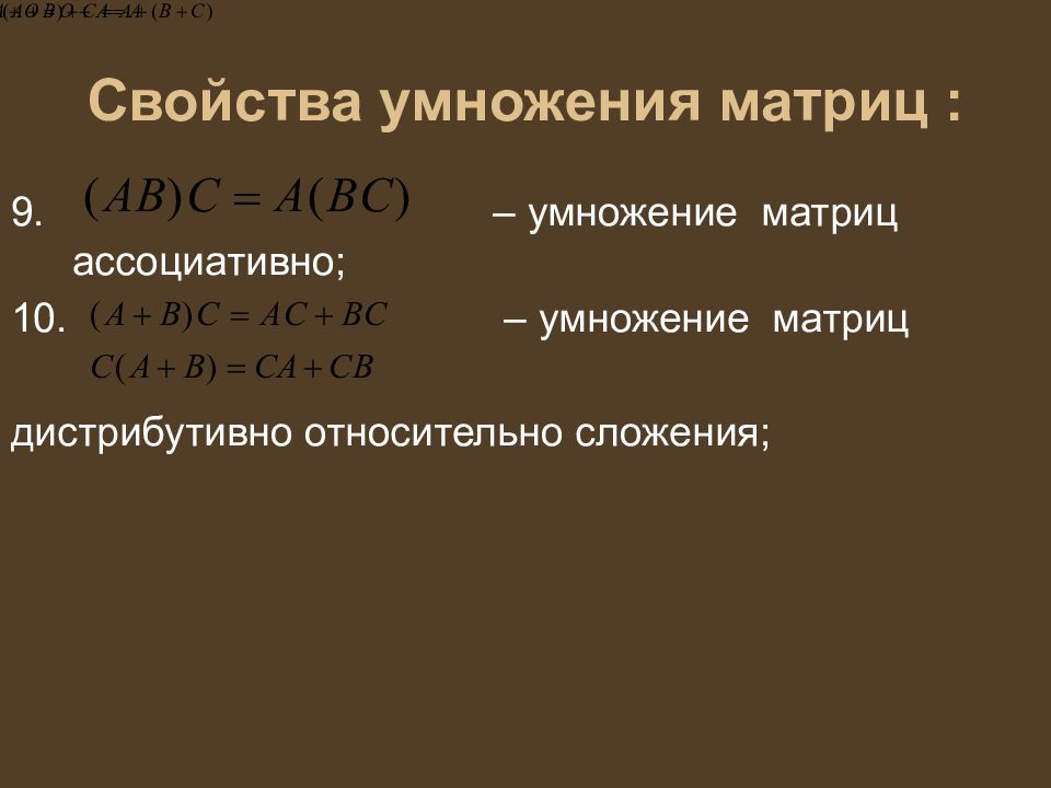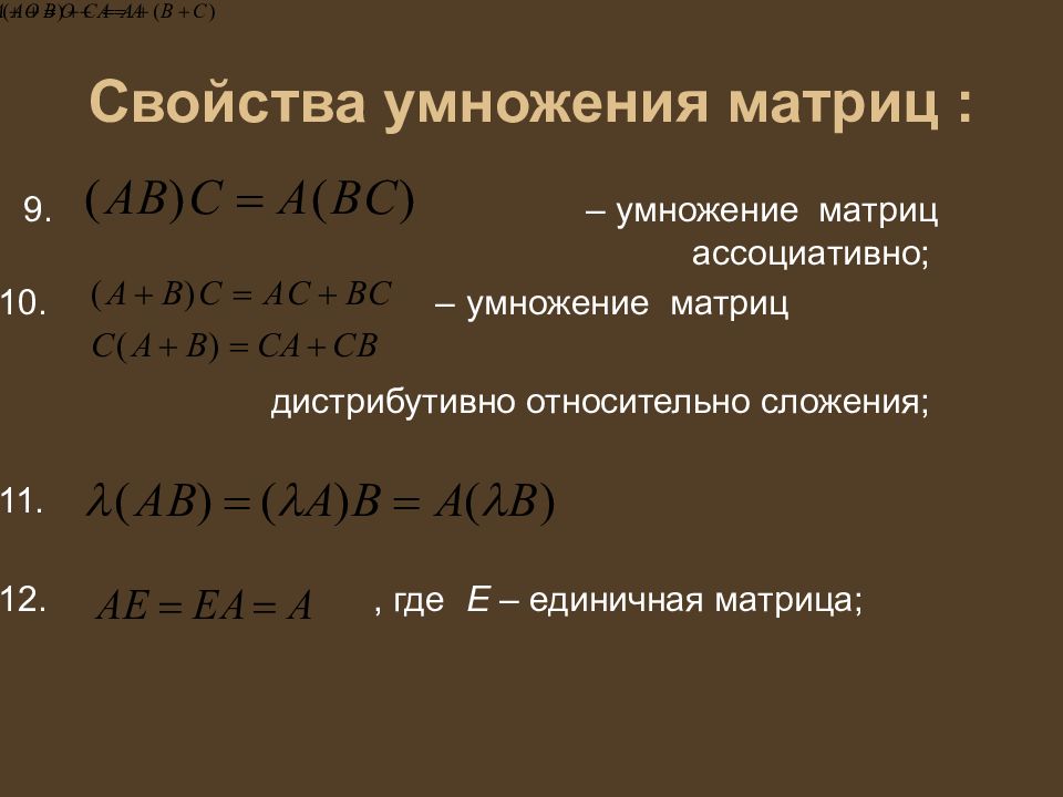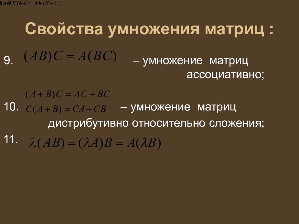 9. – умножение матриц ассоциативно; – умножение матриц дистрибутивно относительно сложения; 11.