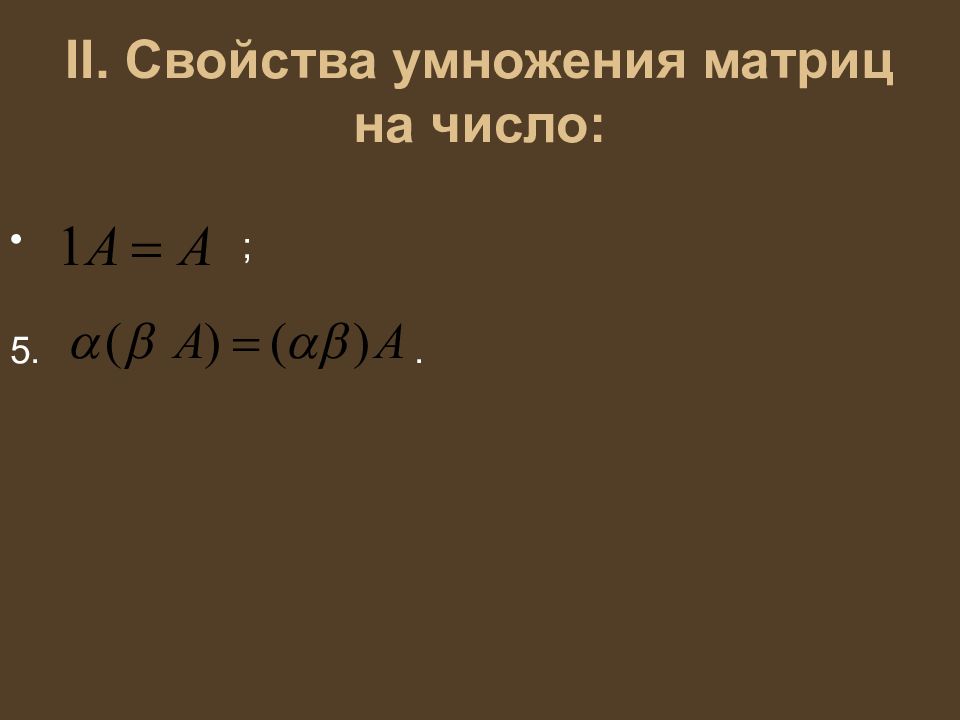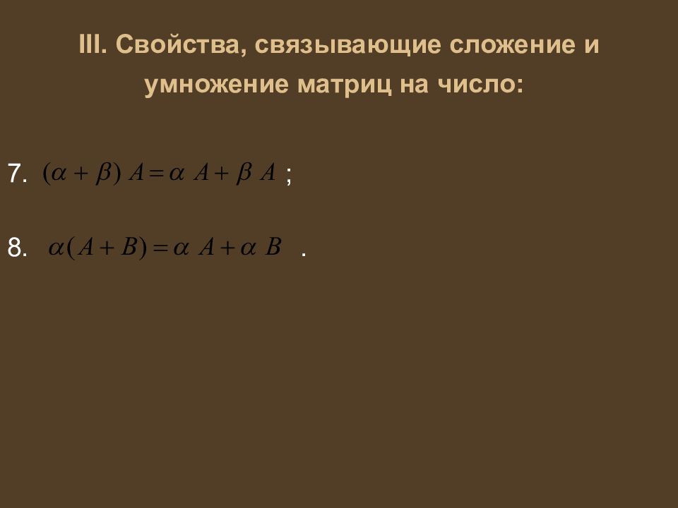 Слайд 11: III. Свойства, связывающие сложение и умножение матриц на число: