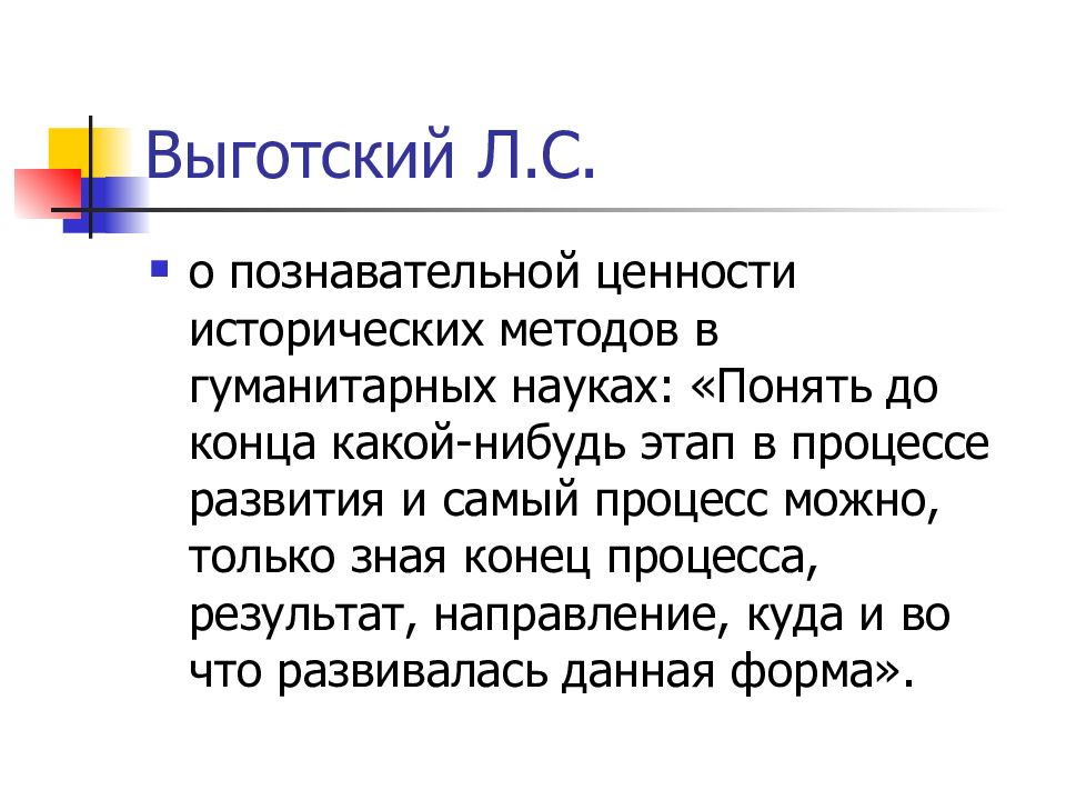 о познавательной ценности исторических методов в гуманитарных науках: «Понять до конца какой-нибудь этап в процессе развития и самый процесс можно, только зная конец процесса, результат, направление, куда и во что развивалась данная форма».