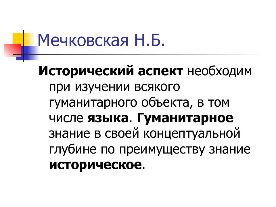 Исторический аспект необходим при изучении всякого гуманитарного объекта, в том числе языка. Гуманитарное знание в своей концептуальной глубине по преимуществу знание историческое.