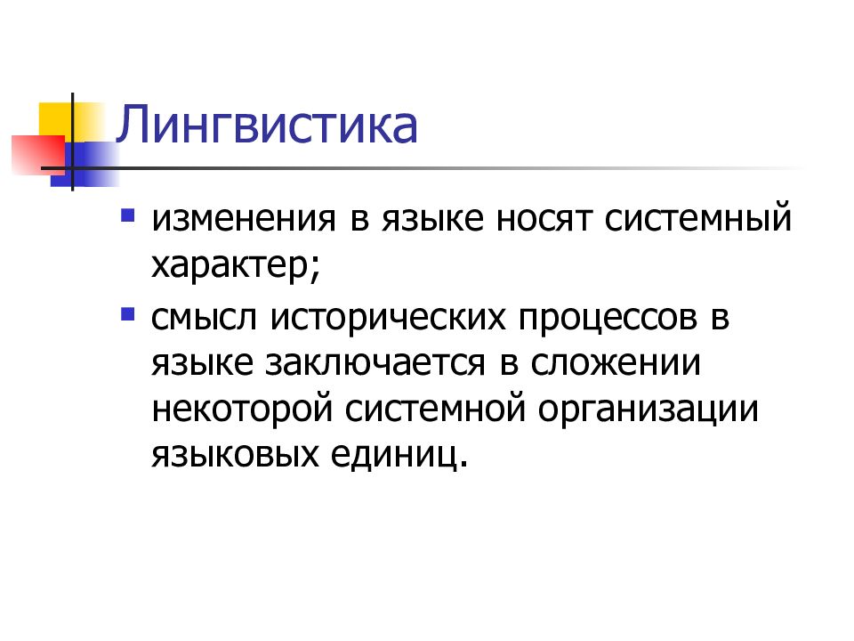 изменения в языке носят системный характер; смысл исторических процессов в языке заключается в сложении некоторой системной организации языковых единиц.