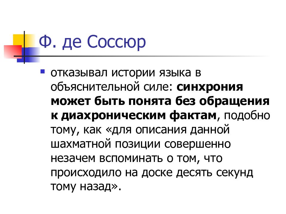 отказывал истории языка в объяснительной силе: синхрония может быть понята без обращения к диахроническим фактам, подобно тому, как «для описания данной шахматной позиции совершенно незачем вспоминать о том, что происходило на доске десять секунд тому назад».