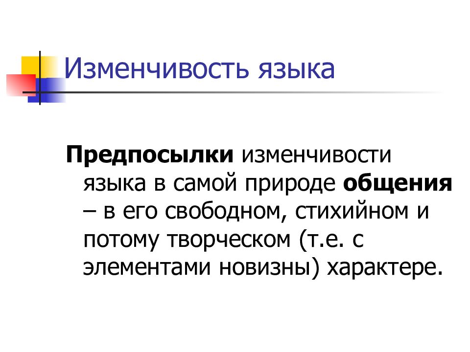 Предпосылки изменчивости языка в самой природе общения – в его свободном, стихийном и потому творческом (т.е. с элементами новизны) характере.
