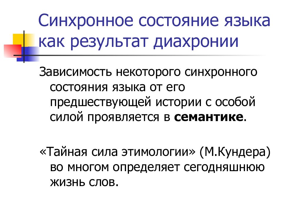 Зависимость некоторого синхронного состояния языка от его предшествующей истории с особой силой проявляется в семантике. «Тайная сила этимологии» (М.Кундера) во многом определяет сегодняшнюю жизнь слов.