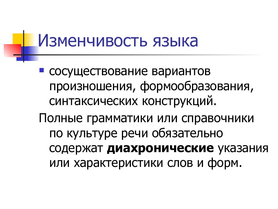 сосуществование вариантов произношения, формообразования, синтаксических конструкций. Полные грамматики или справочники по культуре речи обязательно содержат диахронические указания или характеристики слов и форм.