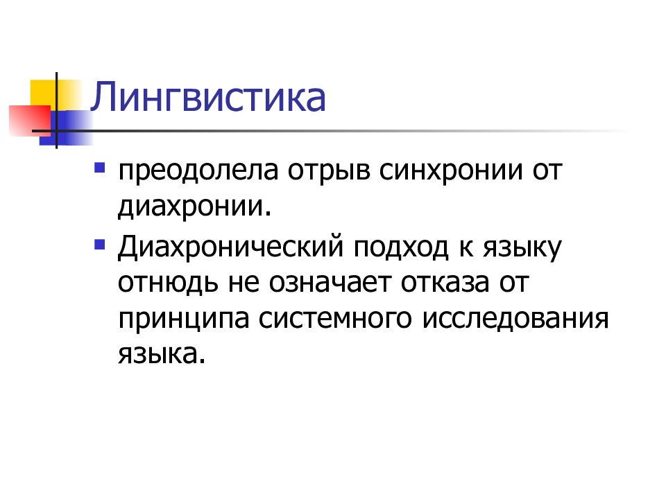 преодолела отрыв синхронии от диахронии. Диахронический подход к языку отнюдь не означает отказа от принципа системного исследования языка.
