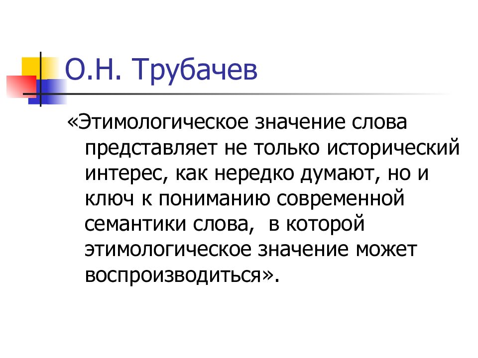 «Этимологическое значение слова представляет не только исторический интерес, как нередко думают, но и ключ к пониманию современной семантики слова, в которой этимологическое значение может воспроизводиться».
