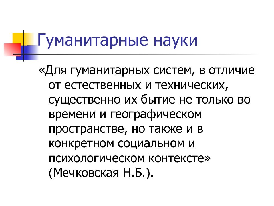 «Для гуманитарных систем, в отличие от естественных и технических, существенно их бытие не только во времени и географическом пространстве, но также и в конкретном социальном и психологическом контексте» (Мечковская Н.Б.).