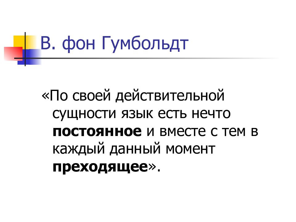 «По своей действительной сущности язык есть нечто постоянное и вместе с тем в каждый данный момент преходящее ».