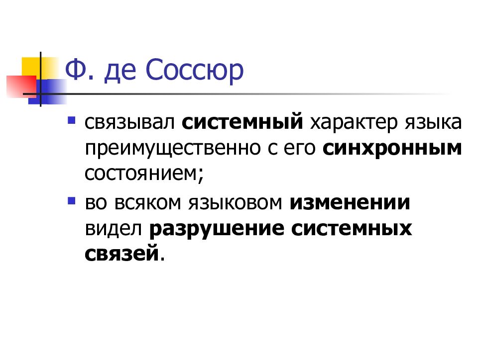 связывал системный характер языка преимущественно с его синхронным состоянием; во всяком языковом изменении видел разрушение системных связей.