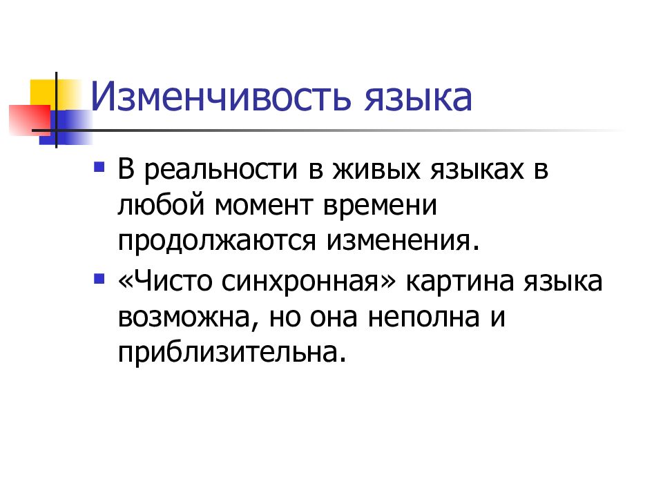 В реальности в живых языках в любой момент времени продолжаются изменения. «Чисто синхронная» картина языка возможна, но она неполна и приблизительна.
