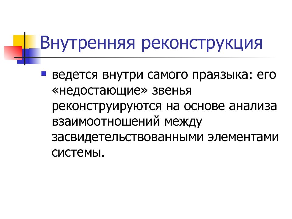 ведется внутри самого праязыка: его «недостающие» звенья реконструируются на основе анализа взаимоотношений между засвидетельствованными элементами системы.