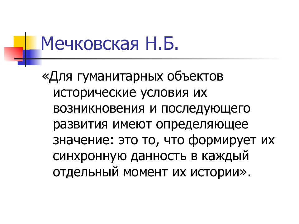 «Для гуманитарных объектов исторические условия их возникновения и последующего развития имеют определяющее значение: это то, что формирует их синхронную данность в каждый отдельный момент их истории».