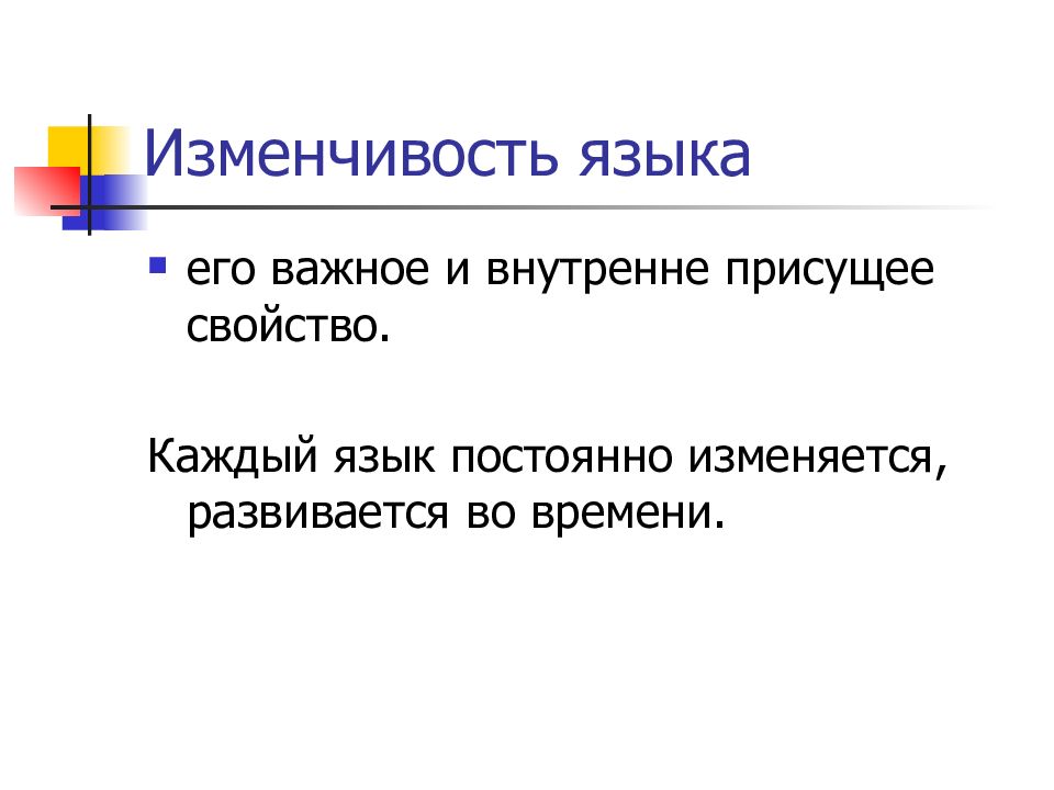 его важное и внутренне присущее свойство. Каждый язык постоянно изменяется, развивается во времени.
