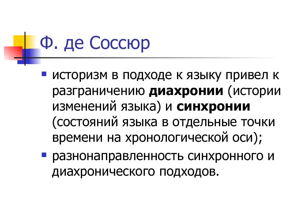историзм в подходе к языку привел к разграничению диахронии (истории изменений языка) и синхронии (состояний языка в отдельные точки времени на хронологической оси); разнонаправленность синхронного и диахронического подходов.
