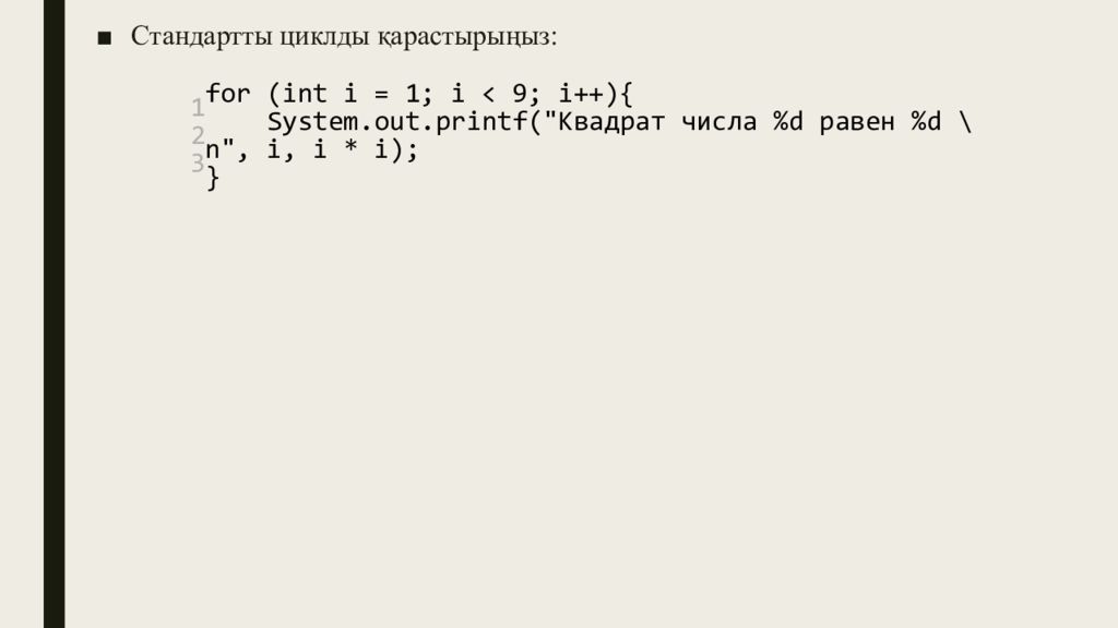 Стандартты циклды қарастырыңыз : 1 2 3 for ( int i = 1; i < 9; i ++){ System.out.printf (" Квадрат числа % d равен % d \n", i, i * i ); }