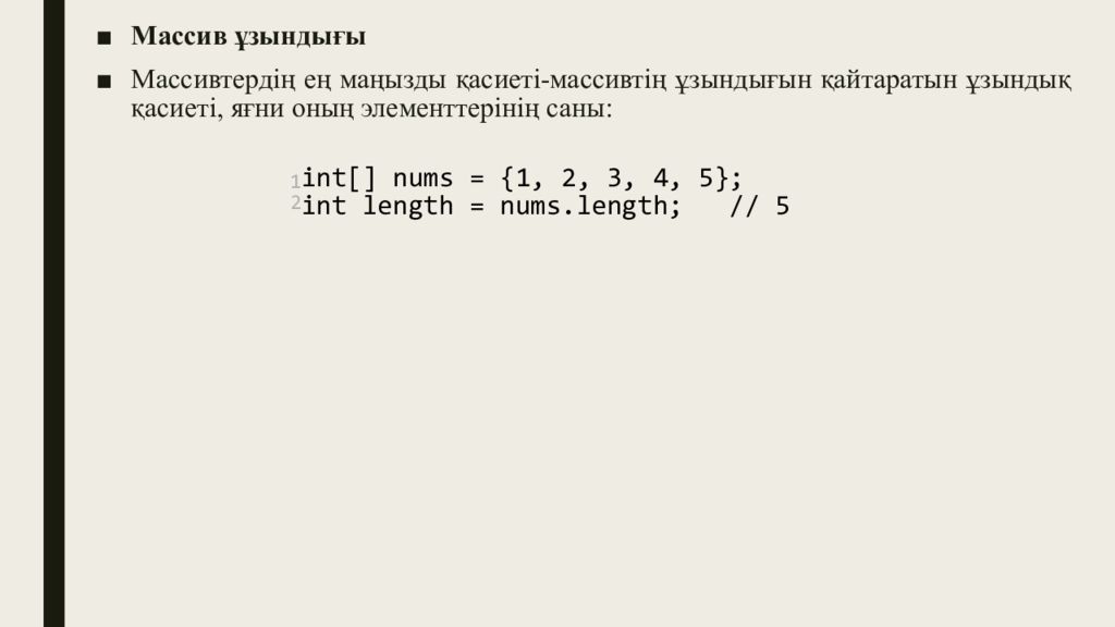 Массив ұзындығы Массивтердің ең маңызды қасиеті-массивтің ұзындығын қайтаратын ұзындық қасиеті, яғни оның элементтерінің саны : 1 2 int [] nums = {1, 2, 3, 4, 5}; int length = nums.length ; // 5