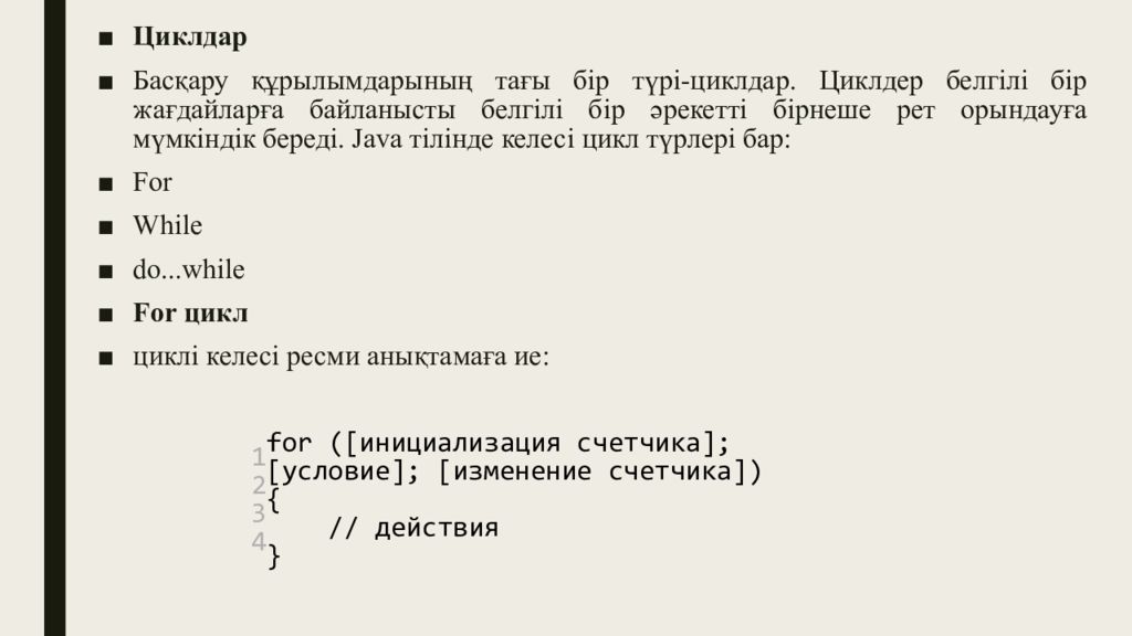 Циклдар Басқару құрылымдарының тағы бір түрі-циклдар. Циклдер белгілі бір жағдайларға байланысты белгілі бір әрекетті бірнеше рет орындауға мүмкіндік береді. Java тілінде келесі цикл түрлері бар : For While do... while For цикл циклі келесі ресми анықтамаға ие : 1 2 3 4 for ([инициализация счетчика]; [условие]; [изменение счетчика]) { // действия }