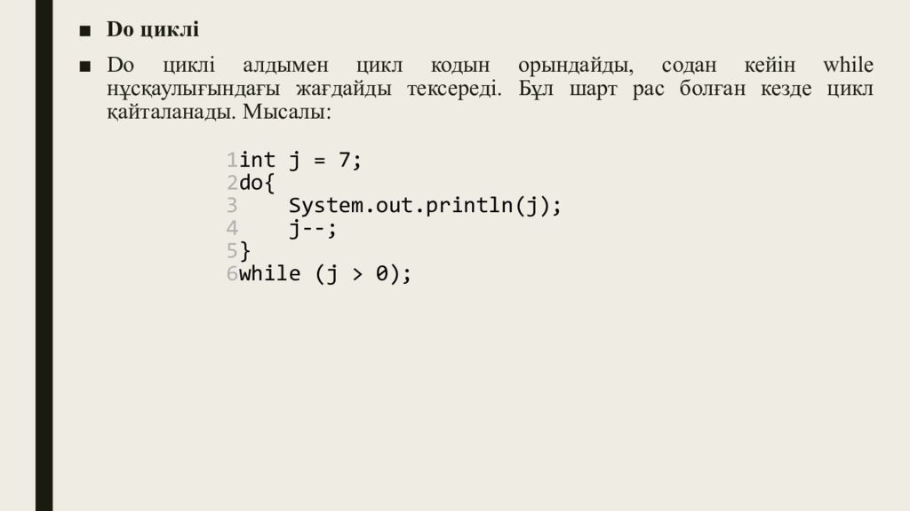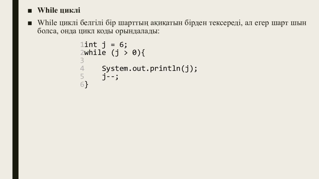 While циклі While циклі белгілі бір шарттың ақиқатын бірден тексереді, ал егер шарт шын болса, онда цикл коды орындалады : 1 2 3 4 5 6 int j = 6; while (j > 0){ System.out.println (j); j--; }