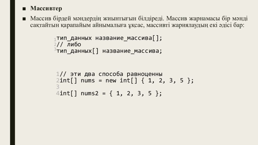 Массивтер Массив бірдей мәндердің жиынтығын білдіреді. Массив жарнамасы бір мәнді сақтайтын қарапайым айнымалыға ұқсас, массивті жариялаудың екі әдісі бар: 1 2 3 тип_данных название_массива []; // либо тип_данных [] название_массива ; 1 2 3 4 // эти два способа равноценны int [] nums = new int [] { 1, 2, 3, 5 }; int [] nums2 = { 1, 2, 3, 5 };