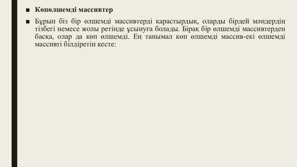 Көпөлшемді массивтер Бұрын біз бір өлшемді массивтерді қарастырдық, оларды бірдей мәндердің тізбегі немесе жолы ретінде ұсынуға болады. Бірақ бір өлшемді массивтерден басқа, олар да көп өлшемді. Ең танымал көп өлшемді массив- екі өлшемді массивті білдіретін кесте :